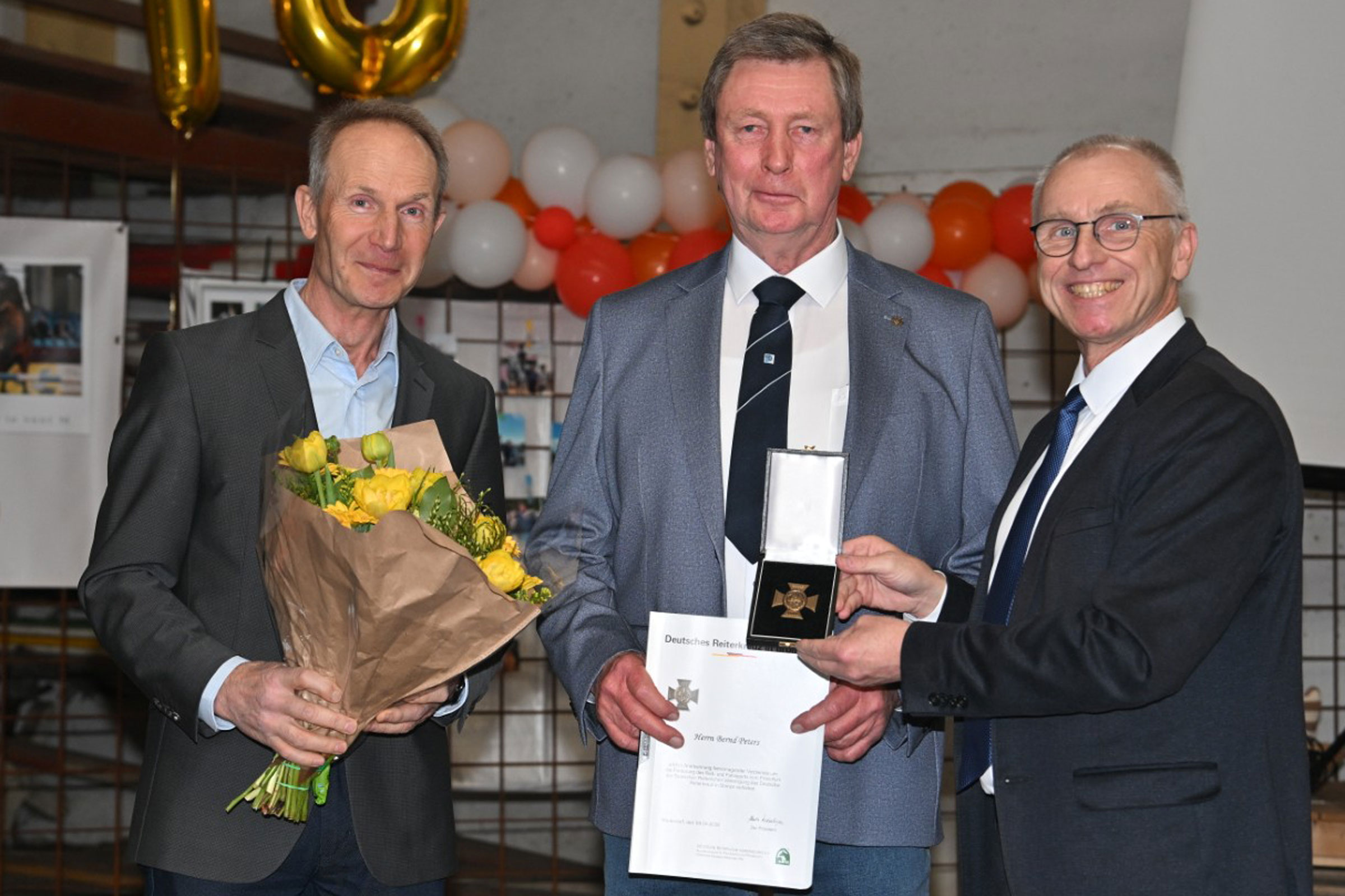 Seit mehr als einem Vierteljahrhundert ist der Landestrainer Bernd Peters eine stabile Konstante im Landesverband Berlin-Brandenburg (LPBB). Anlässlich seines 70. Geburtstags wurde er jetzt in Bergholz-Rehbrücke aufgrund seiner vielen persönlichen Leistungen im und für den Pferdesport mit dem Deutschen Reiterkreuz in Bronze ausgezeichnet. Die Ehrung übernahm Thomas Vos, Interessenvertreter der AG Landesverbände und Mitglied im Präsidium von Pferdesport Deutschland.